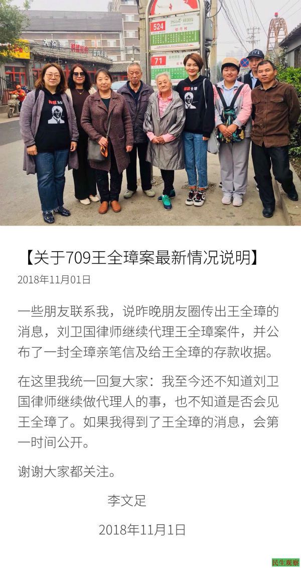 王全璋有消息?李文足称律师会见称“身体正常” (2018年07月13日)