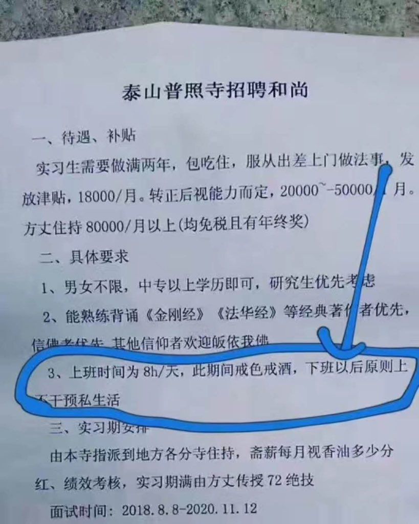 泰山普照寺招假和尚:待遇优厚,下班后不干预私生活 (图) (2018年08月15日)