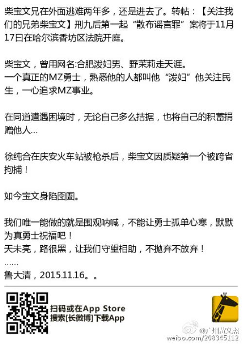 声援徐纯合枪击案被指造谣 柴宝文遭重判3年 (图) (2015年11月26日)