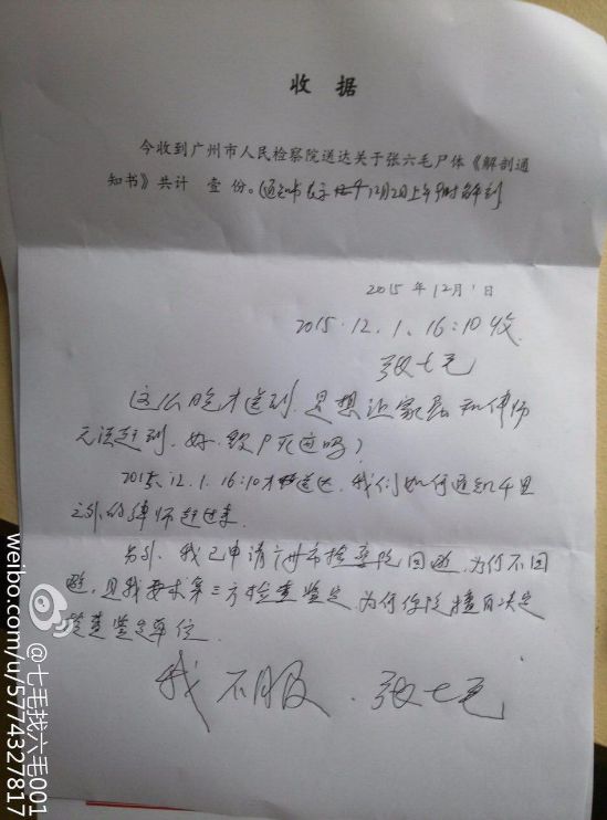 张六毛看守所死亡:广州当局2日上午9时强行尸检 (图) (首发) (2015年12月01日)