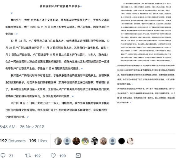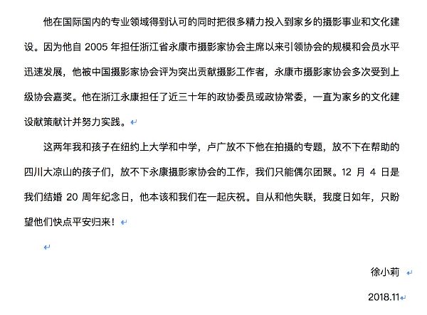 受邀到新疆进行交流 摄影师卢广失联三周 (图) (2018年11月27日)
