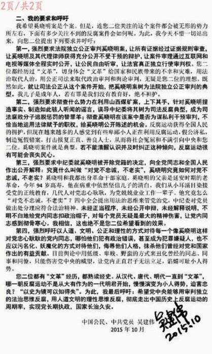 公民要求法院公开审理奚晓明案致习近平和王岐山公开信 (图) (首发) (2015年10月23日)