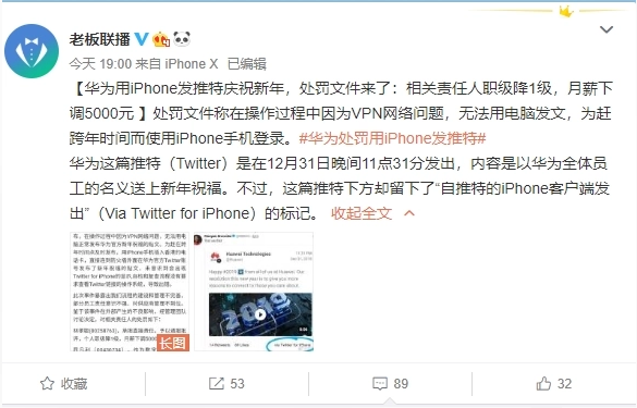 1月3日晚间消息,2019年1月1日华为官方Twitter账号发布了新年祝福的贴文,右下角出现了Twitter for iPhone的显示。而网络曝光的文件显示,华为决定对相关责任人月薪下调5000元,个人职级降1级。