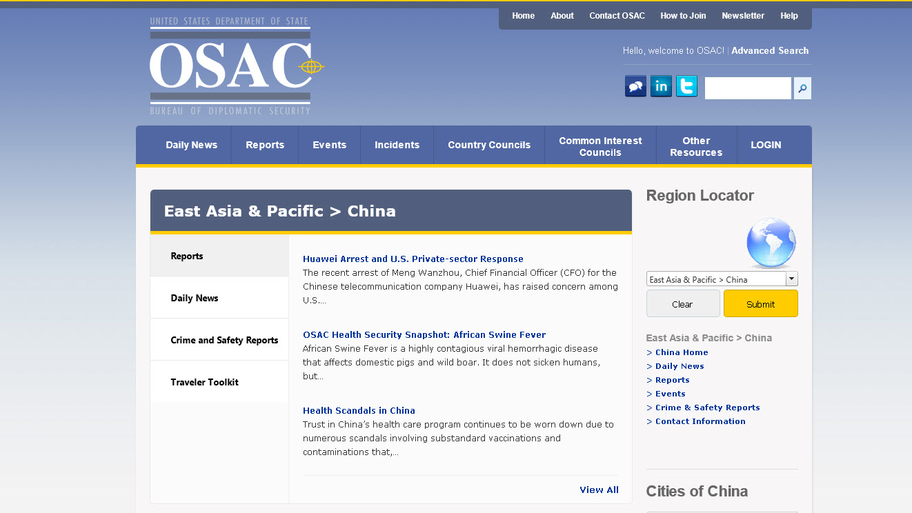 美国国务院针对国民前往中国旅行发出警告
